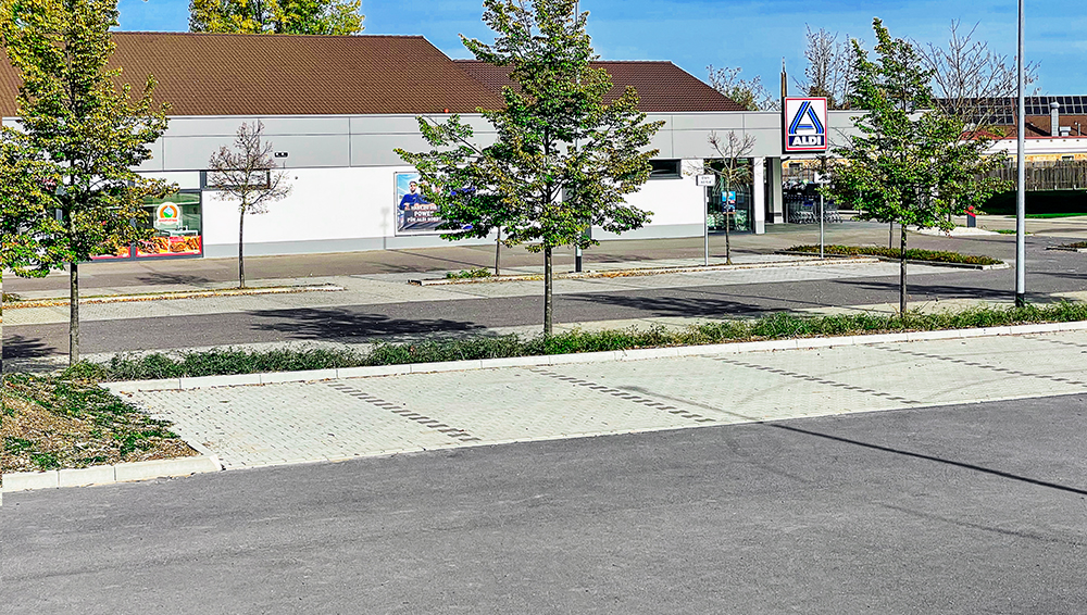 Unten im Bild unser überwiegend auf den Einzelhandel ausgerichteter Handelspark in Apolda. Nach dem Totalverlust des dortigen Aldimarktes am 18.01.2021 durch Brandschaden errichteten wir hier am selben Ort unsere neue hochmoderne Gewerbeimmobilie für Aldi – typisch Genossenschaft, nach vorn blicken!